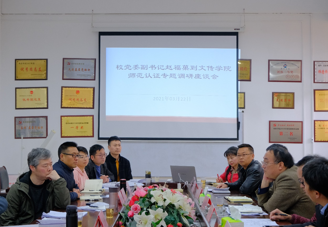 3月22日,校党委副书记赵福菓到文化传媒学院开展师范专业认证工作专题调研,党委办公室副主任(机关党委书记)曾旭葵、教育研究与评估中心主任黄先智、宣传部副部长段炼、教务处副处长蒋泽标、副处长刘合财、学生处副处长余雪玉、团委副书记黄明珠、教育科学学院副院长余水陪同调研。调研以座谈会形式在博雅楼3621会议室进行,文化传媒学院班子成员、教研室主任、汉语言文学专业相关教师参加座谈会。