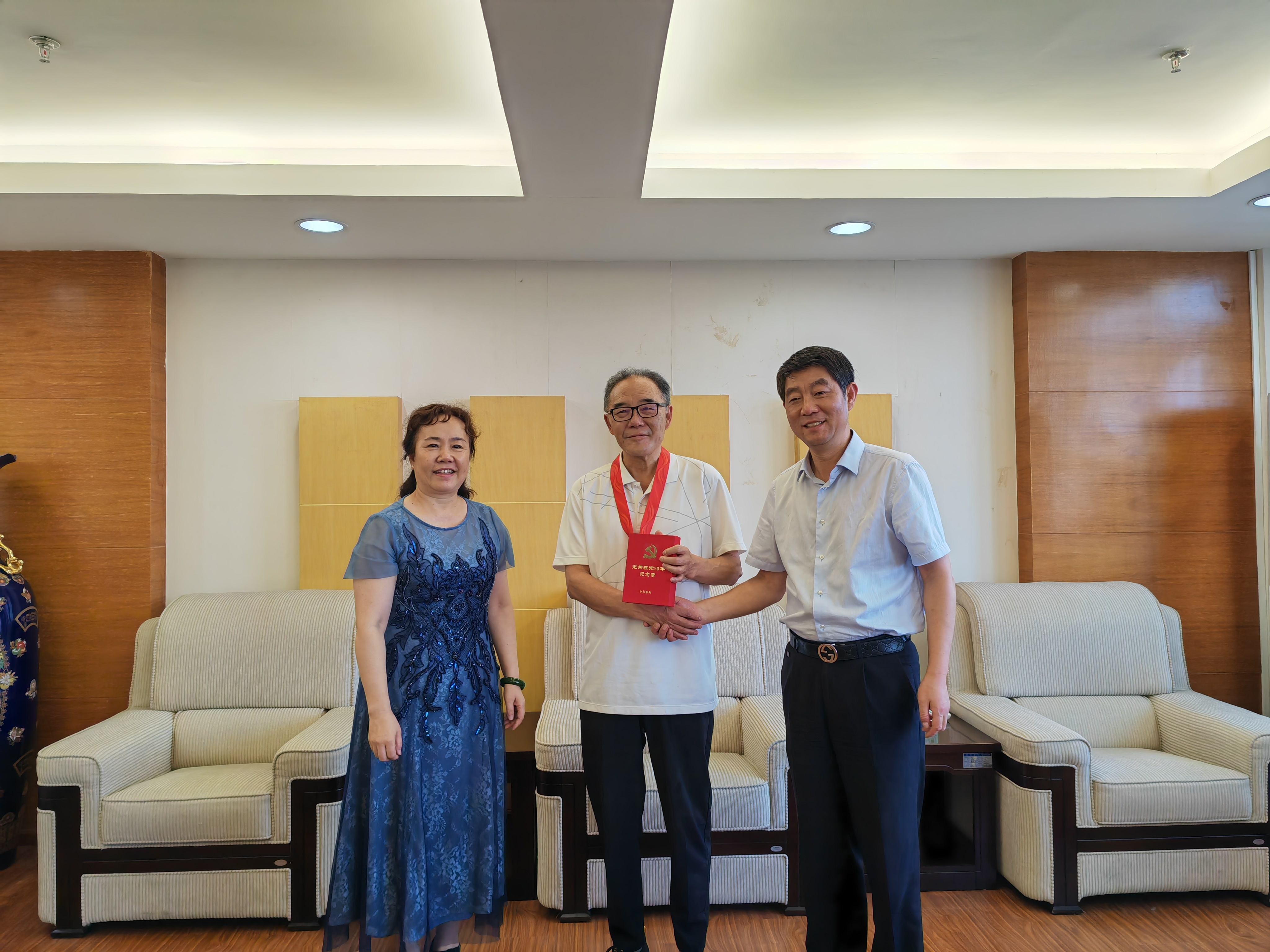七一前夕,“光荣在党50年”纪念章颁发仪式在九思楼7楼举行。校党委书记吕保平,党委副书记焦艳出席颁发仪式并为我校退休老党员颁发纪念章。