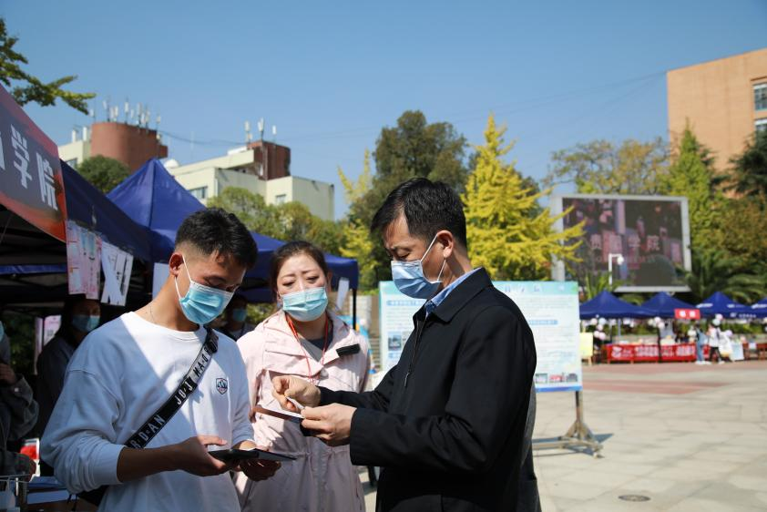 “同学从哪儿来啊?学的什么专业?”在新生报到处,邓朝勇亲切地与新生交流着,叮嘱新生们要做好大学学习规划,精进学业,增长才干。同时,他还叮嘱志愿者同学们在做好迎新工作时,要注意个人防护。