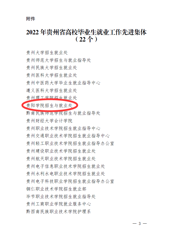学校党委行政认真贯彻习近平总书记关于就业工作系列重要指示批示精神,全面落实党中央国务院“稳就业”“保就业”决策部署,高度重视毕业生就业工作,深入实施就业“一把手工程”,始终把毕业生就业纳入学校重要议事日程,千方百计促进毕业生更加充分更高质量就业;不断健全完善制度机制,不断提高就业服务水平,强化就业指导,积极引导毕业生转变就业观念,引导鼓励毕业生到贵阳贵安就业创业、到基层和中小企业就业创业。我校毕业生就业工作取得显著成效,书记校长“访企拓岗”力度大,毕业生供需见面和双向选择活动有效,困难毕业生群体帮扶有力,就业统计资料管理规范,就业统计数据真实准确,用人单位和毕业生满意度高。2022年圆满完成省委、省政府“双八”目标任务,在全省同类本科院校就业工作中走在前列,获得省教育厅充分肯定。