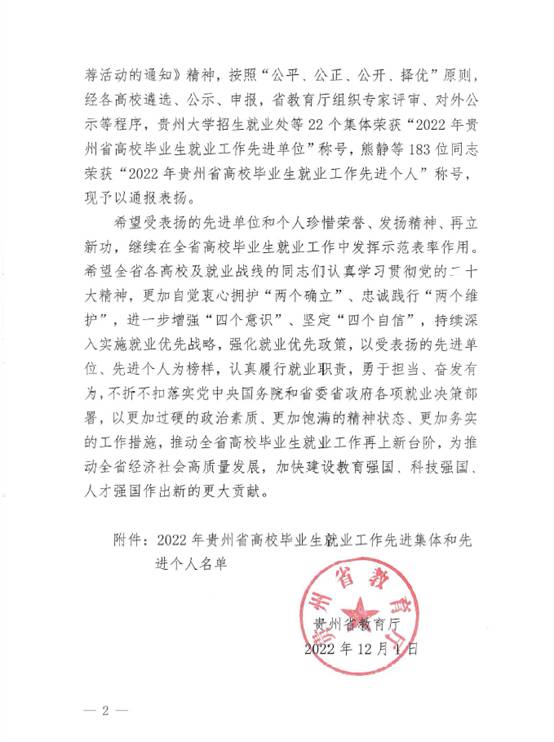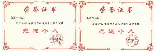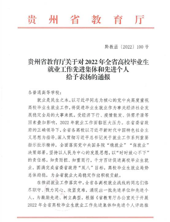 近日,贵州省教育厅下发了《贵州省教育厅关于对2022年全省高校毕业生就业工作先进集体和先进个人给予表扬的通报》(黔教函〔2022〕100号),我校招生与就业处荣获“2022年贵州省高校毕业生就业工作先进集体”荣誉称号。数学与信息科学学院就业指导教师成清华、美术学院就业指导教师雷志坤2人荣获“2022年贵州高校毕业生就业工作先进个人”称号。