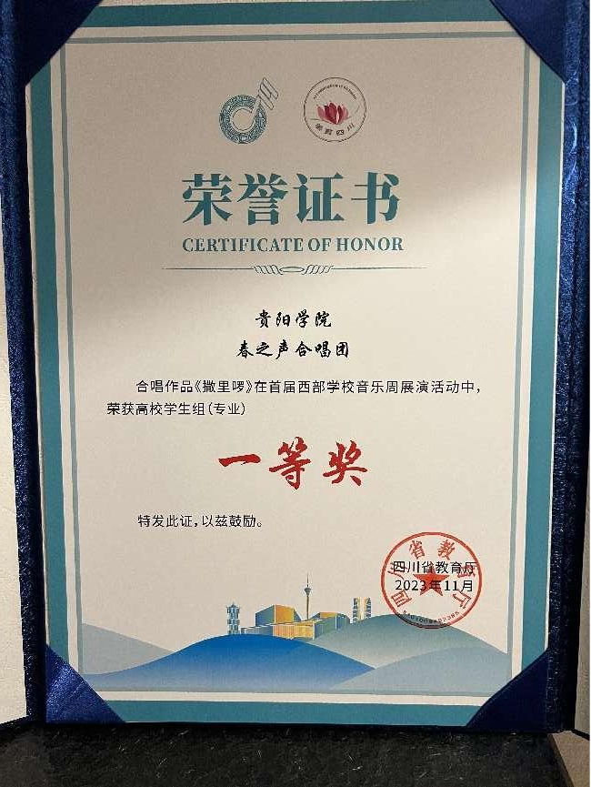 展演分为小学组、中学组、高校组(非专业、专业)三个组别进行展演。由贵州省教育厅选送的海燕政策研究论坛线路1“春之声”合唱团代表贵州参加展演活动,经过激烈的比拼不负众望,学校“春之声”合唱团荣获了高校学生组(专业)一等奖,为贵州争得了荣誉。